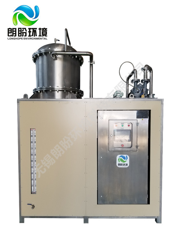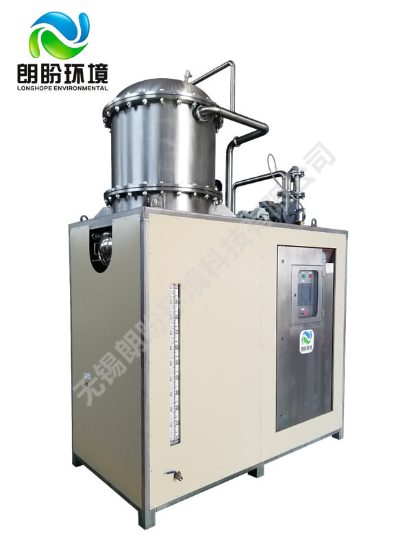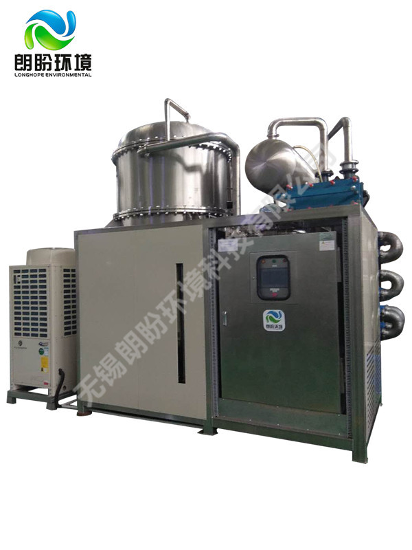 熱泵濃縮蒸發(fā)器的原理是物料的沸點隨著壓強的降低而降低。低溫節(jié)能濃縮設(shè)備整體保持真空狀態(tài),濃縮室的真空度約為95%~97%,在此壓強下水的沸點為35℃~37℃,系統(tǒng)無需配備進料泵,利用蒸發(fā)室的負壓將物料吸進蒸發(fā)室,通過強制循環(huán)方式將物料循環(huán)霧化,傳輸至換熱器上,物料中水分被蒸發(fā),物料連續(xù)循環(huán)霧化,通過蒸發(fā)室液位自動補料,濃度達到要求后作為濃縮液排出設(shè)備。濃縮液一般粘度較大,需采用泵抽出。